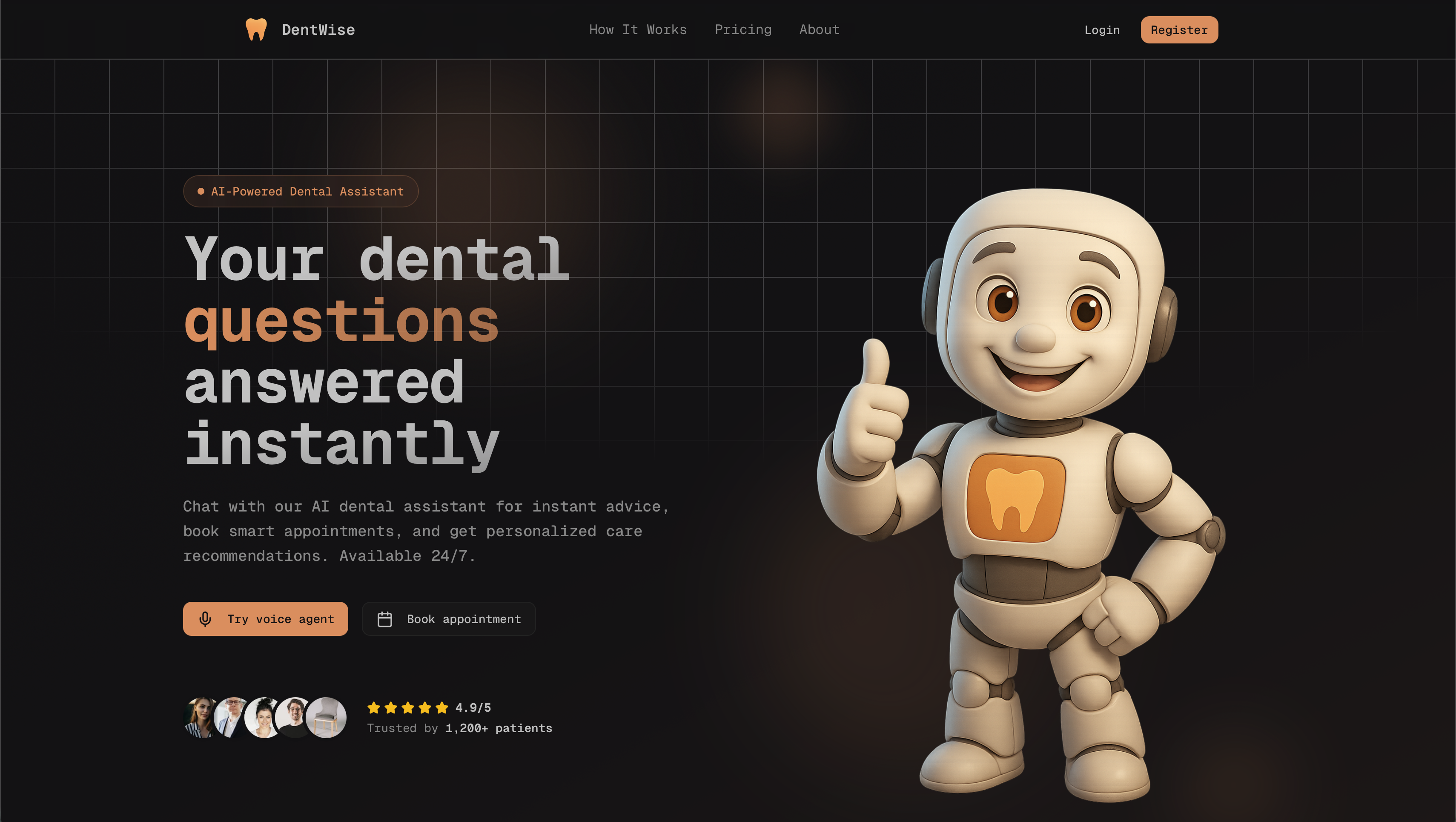 An AI-powered dental assistant platform that streamlines appointment booking while providing intelligent voice-based consultations for dental inquiries, oral health guidance, and DentWise services, enhancing patient engagement, accessibility, and overall dental care experience.